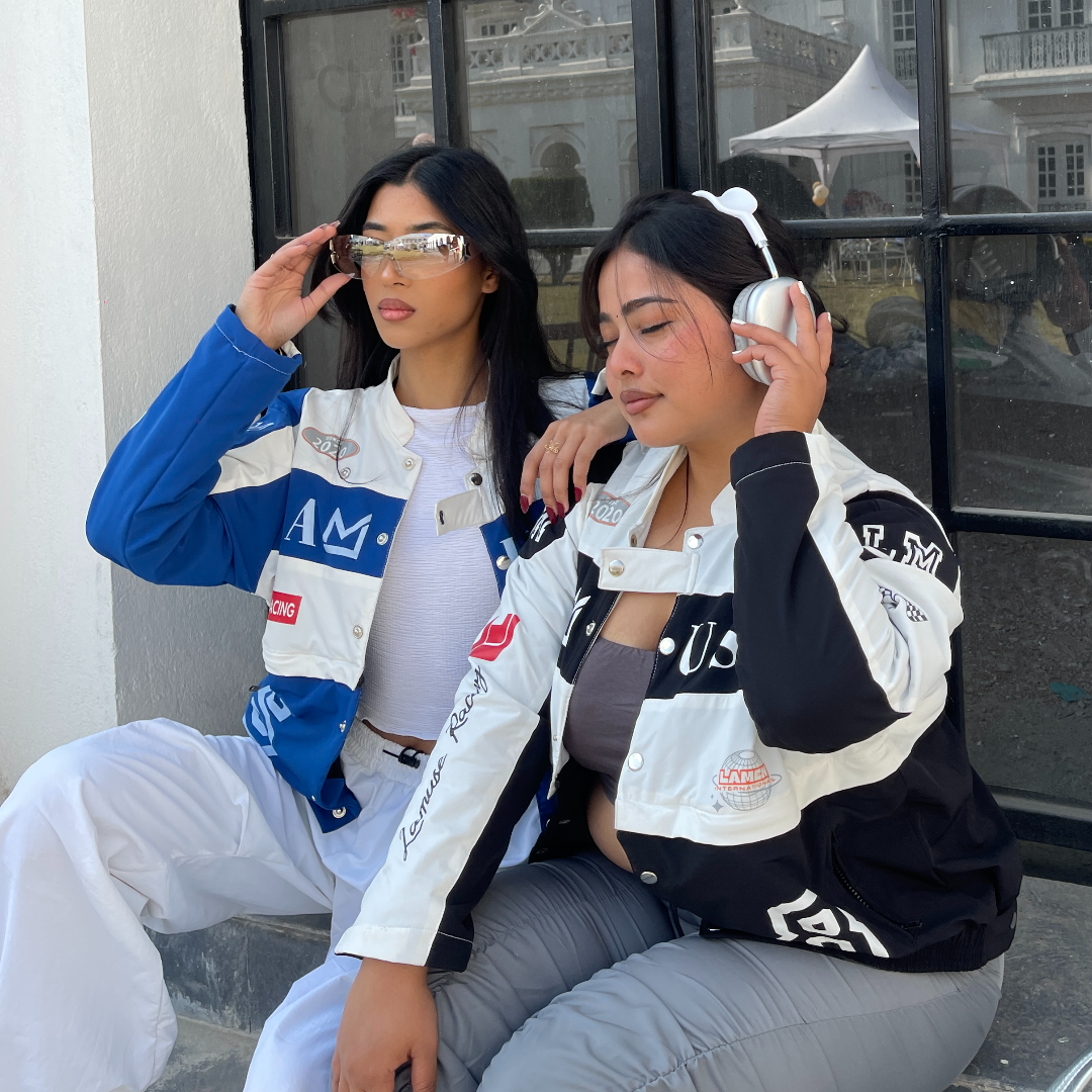 Introducing our innovative 3-in-1 jacket inspired by the sleek aesthetics of racing jackets with cutting edge fashion that offers three distinct styles (full length oversized jacket, cropped jacket & Skirt) in one dynamic package.