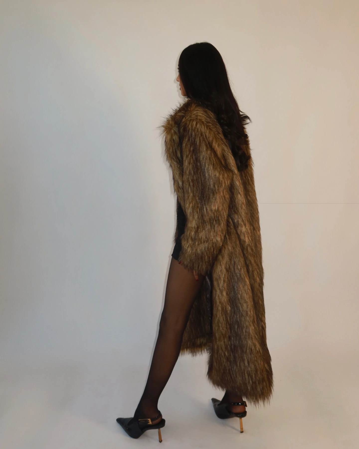 Turn effortless edge into a lifestyle with our Cassie Faux Fur Overcoat, a rich, moody statement piece designed for bold, confident looks all season long. Crafted from luxurious, multi toned faux fur, this coat blends deep chestnut, espresso, and warm golden hues to create a natural, high end texture that feels as striking as it looks.