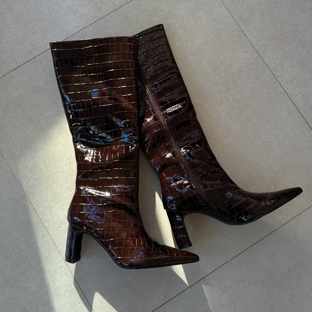 Make a bold statement with these stunning croc-embossed knee-high boots. Designed with a pointed toe and a sturdy block heel. The premium faux crocodile leather finish adds a touch of luxury, while the sleek silhouette pairs effortlessly with dresses, skirts, or skinny jeans.