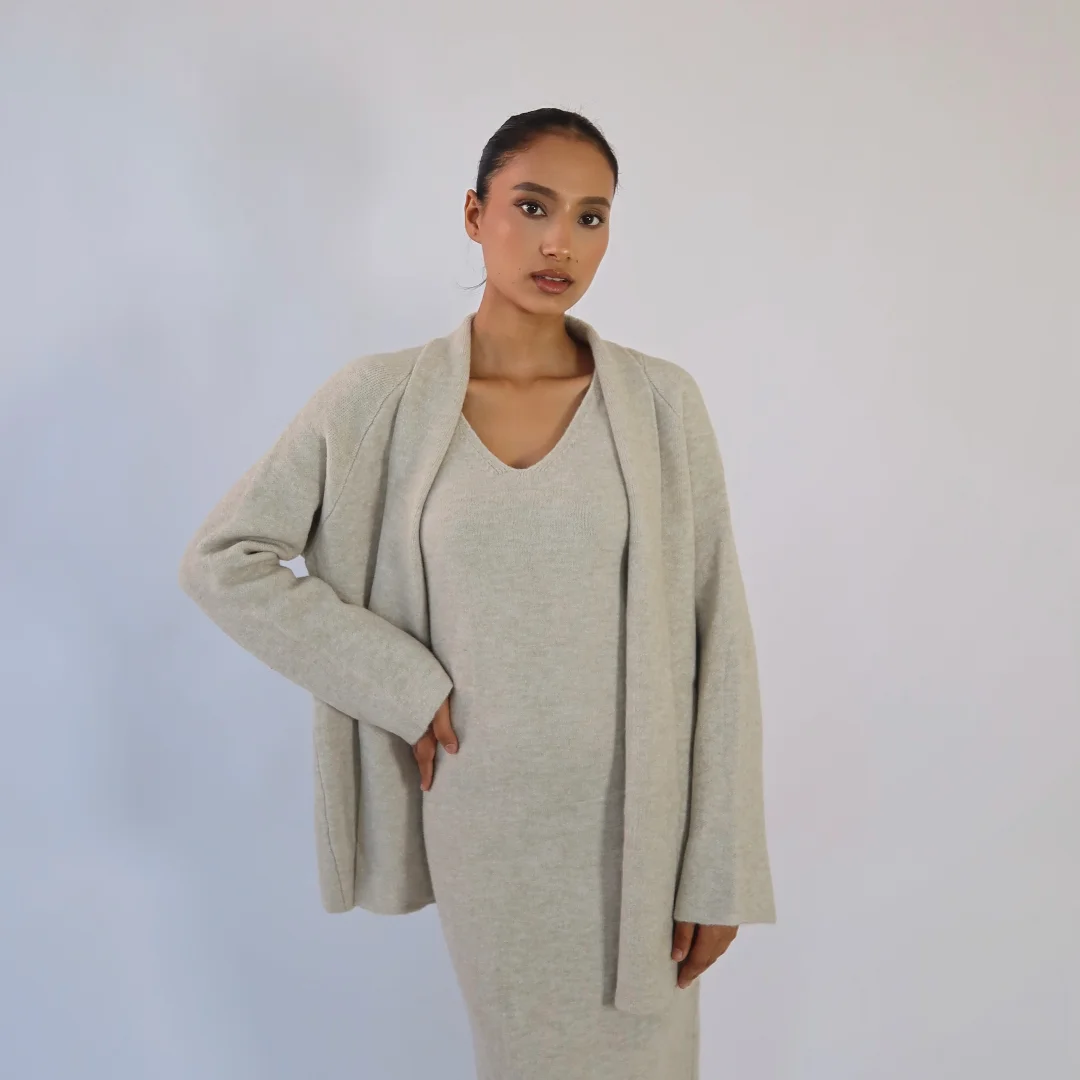 Elevate your look with the Kashmere Set, a perfect blend of comfort and elegance. This set features a sleeveless cashmere dress paired with a cozy matching cardigan for an added layer of warmth and sophistication. Its timeless design makes it versatile for casual outings or semi-formal events. Wrap yourself in the luxurious feel of cashmere and enjoy the perfect combination of style and comfort.