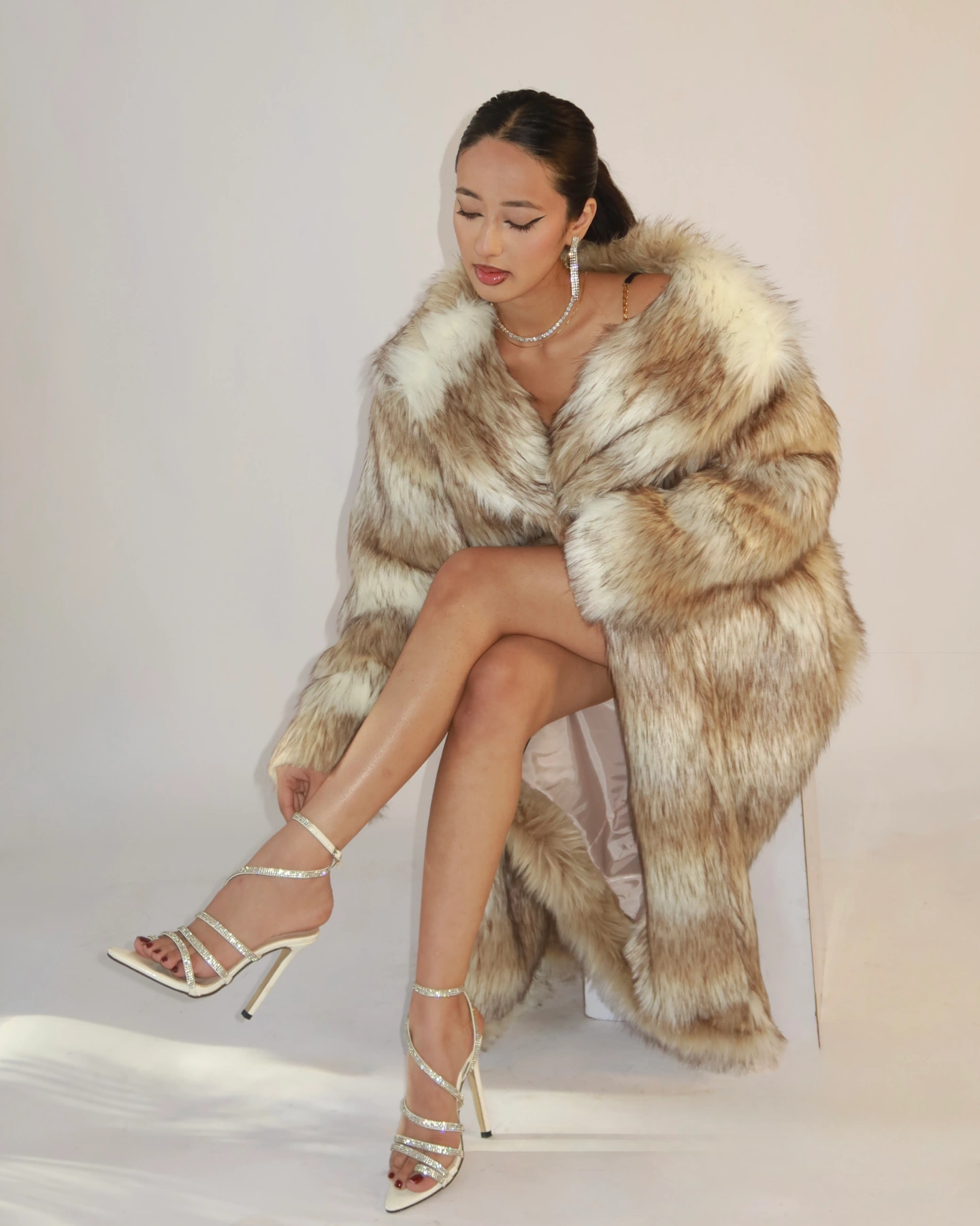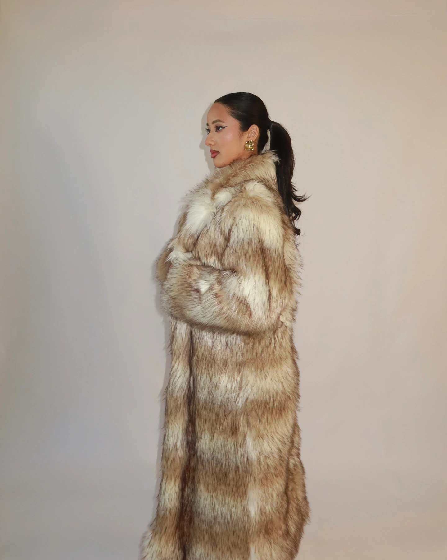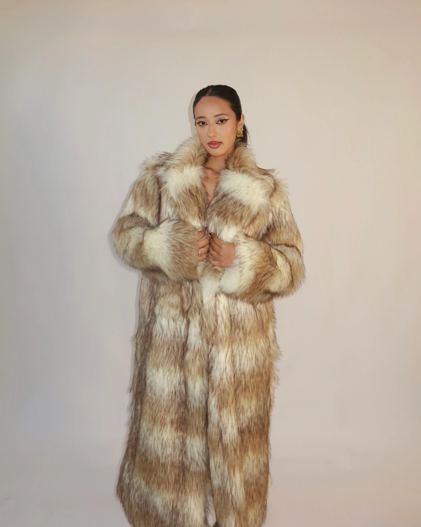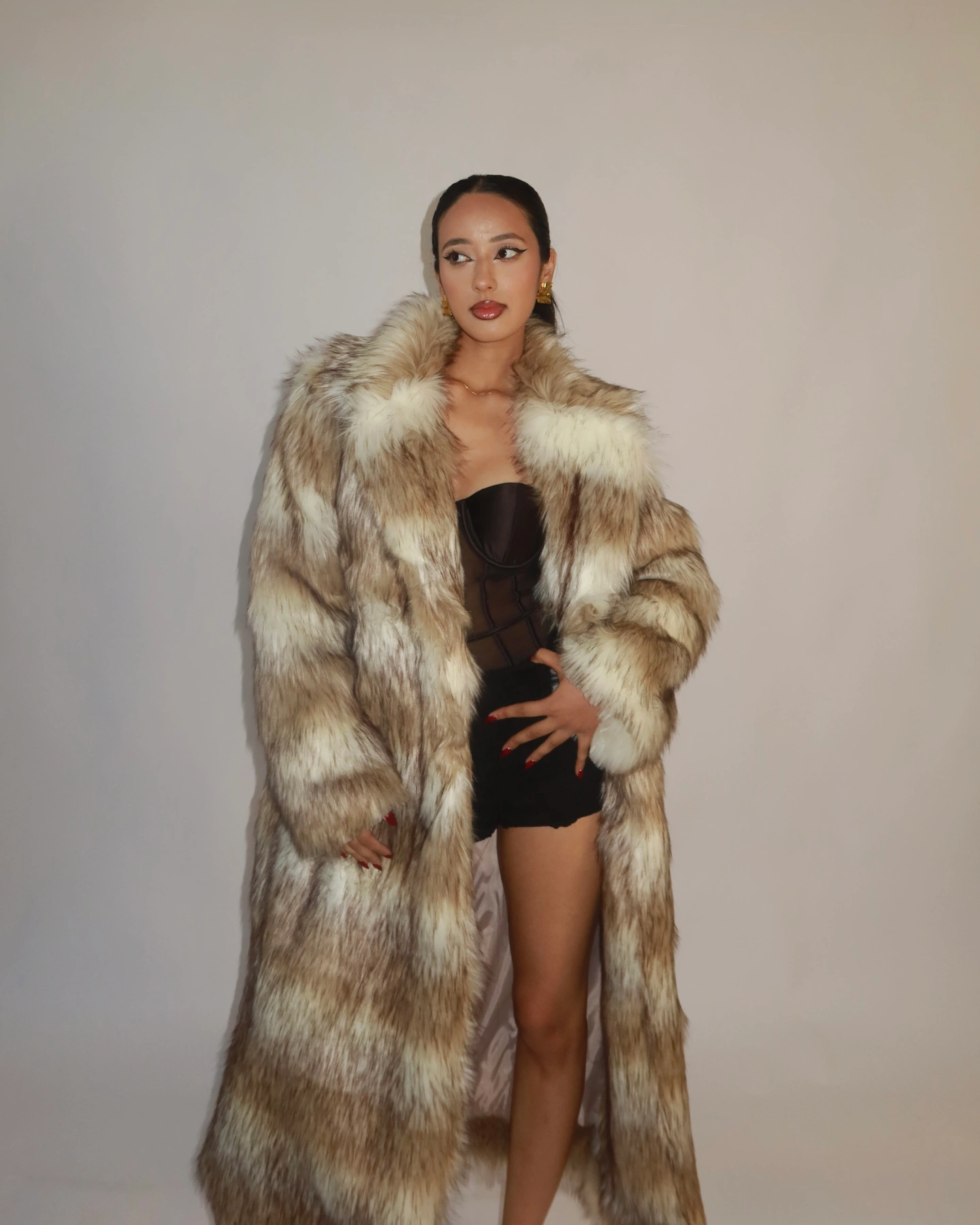 Command every room with unapologetic elegance. The Lady Faux Fur Overcoat is a tribute to old world luxury and modern confidence, blending Slavic opulence with the bold glamour of the mob wife aesthetic. Crafted from ultra soft, cruelty-free faux fur, its rich caramel and ivory tones create a naturally decadent texture that feels as indulgent as it looks.