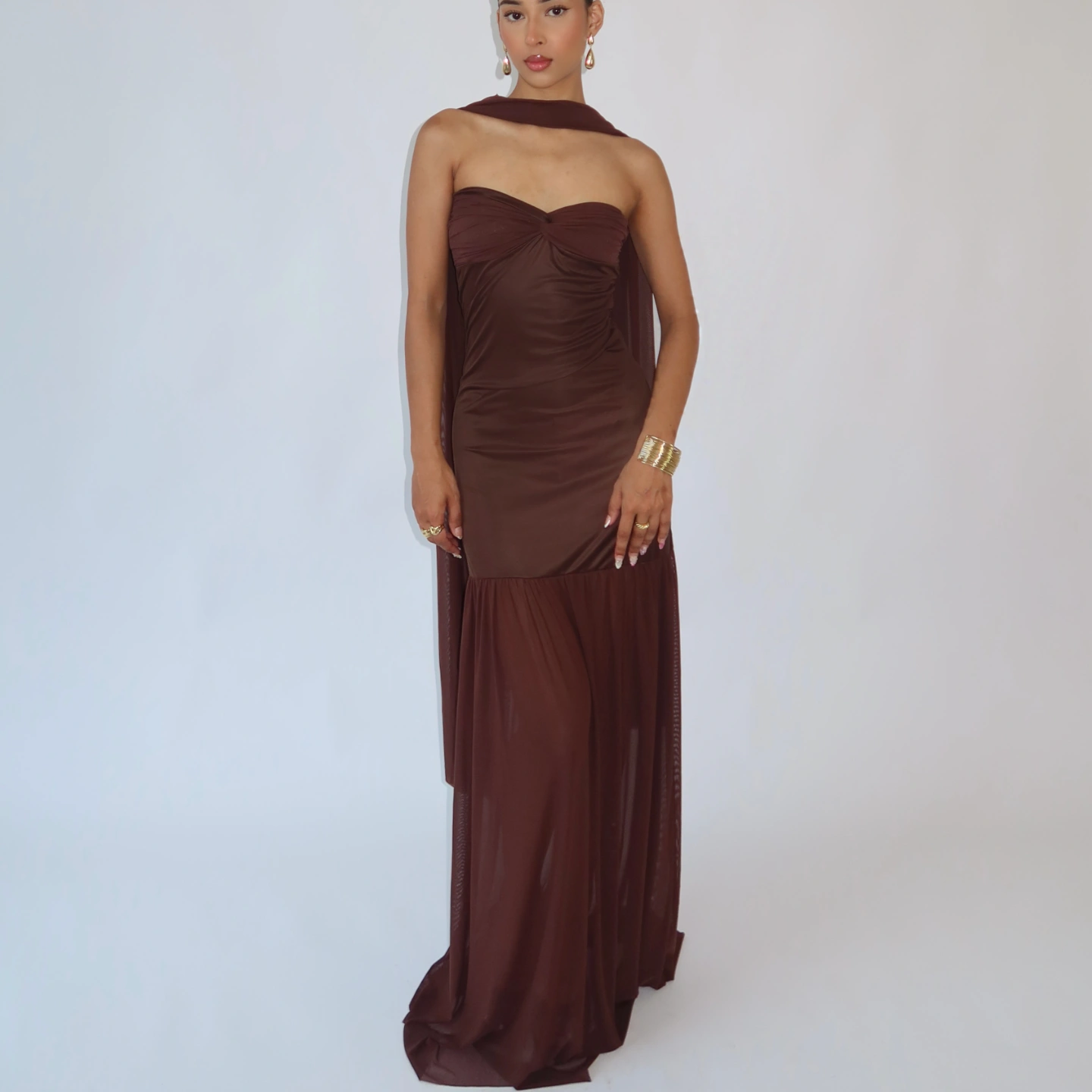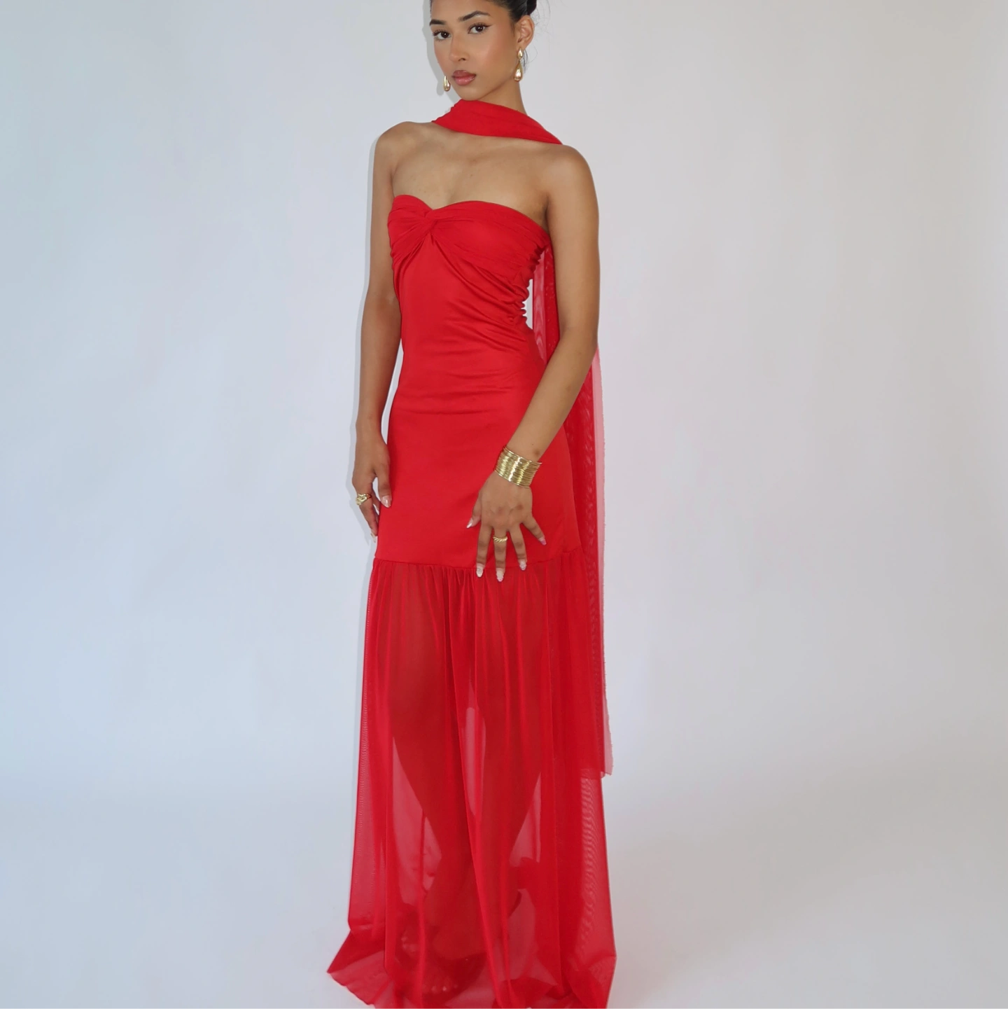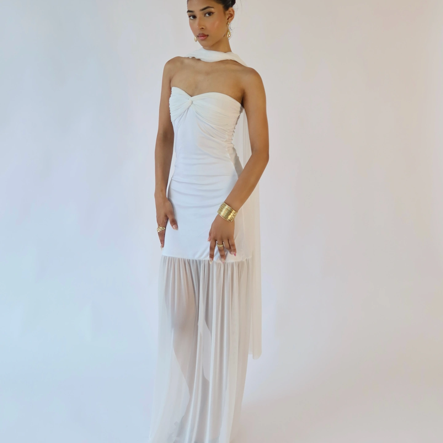 Make a statement with the Lumi Dress: a luxurious, figure-hugging gown crafted from premium mesh for a flawless silhouette. Featuring a strapless sweetheart neckline and flattering ruching, this elegant piece flows into a sheer draped skirt for a touch of drama. Perfect for evening events or special occasions, the Lumi Dress comes with a matching mesh shawl for added elegance.