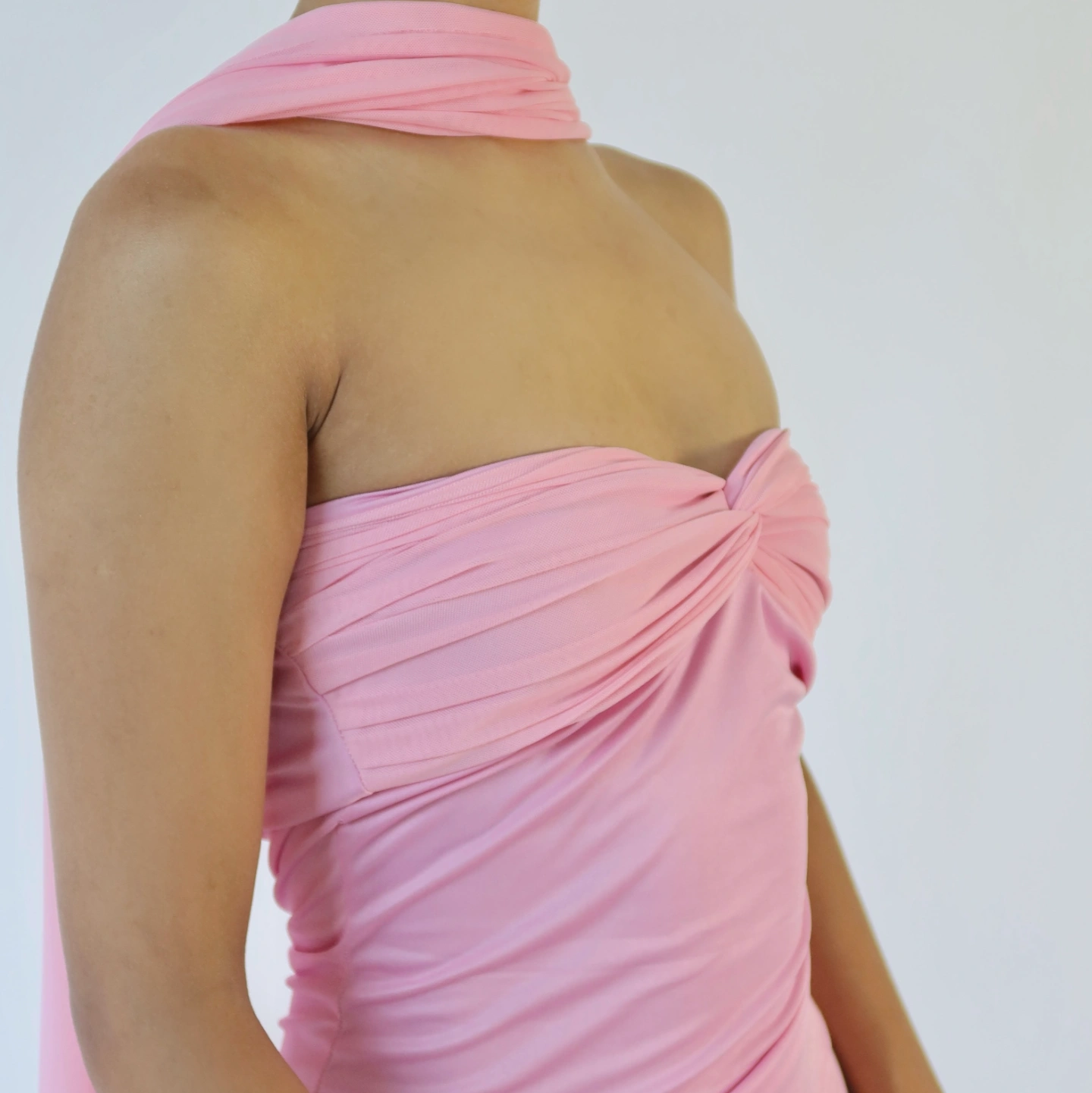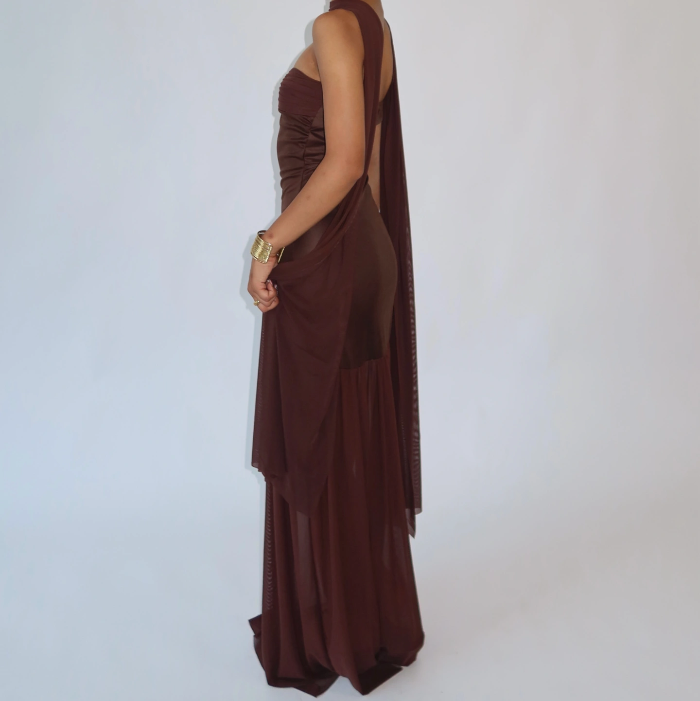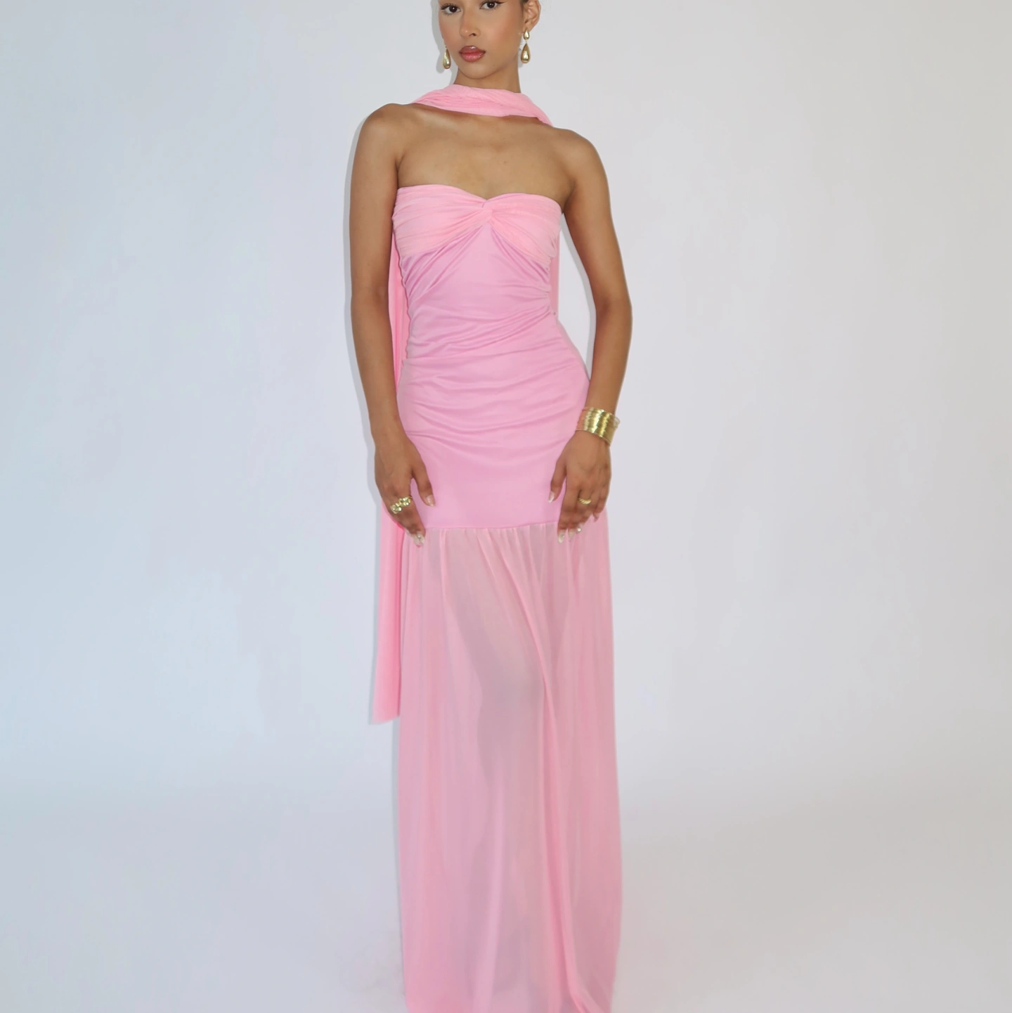 Make a statement with the Lumi Dress: a luxurious, figure-hugging gown crafted from premium mesh for a flawless silhouette. Featuring a strapless sweetheart neckline and flattering ruching, this elegant piece flows into a sheer draped skirt for a touch of drama. Perfect for evening events or special occasions, the Lumi Dress comes with a matching mesh shawl for added elegance.