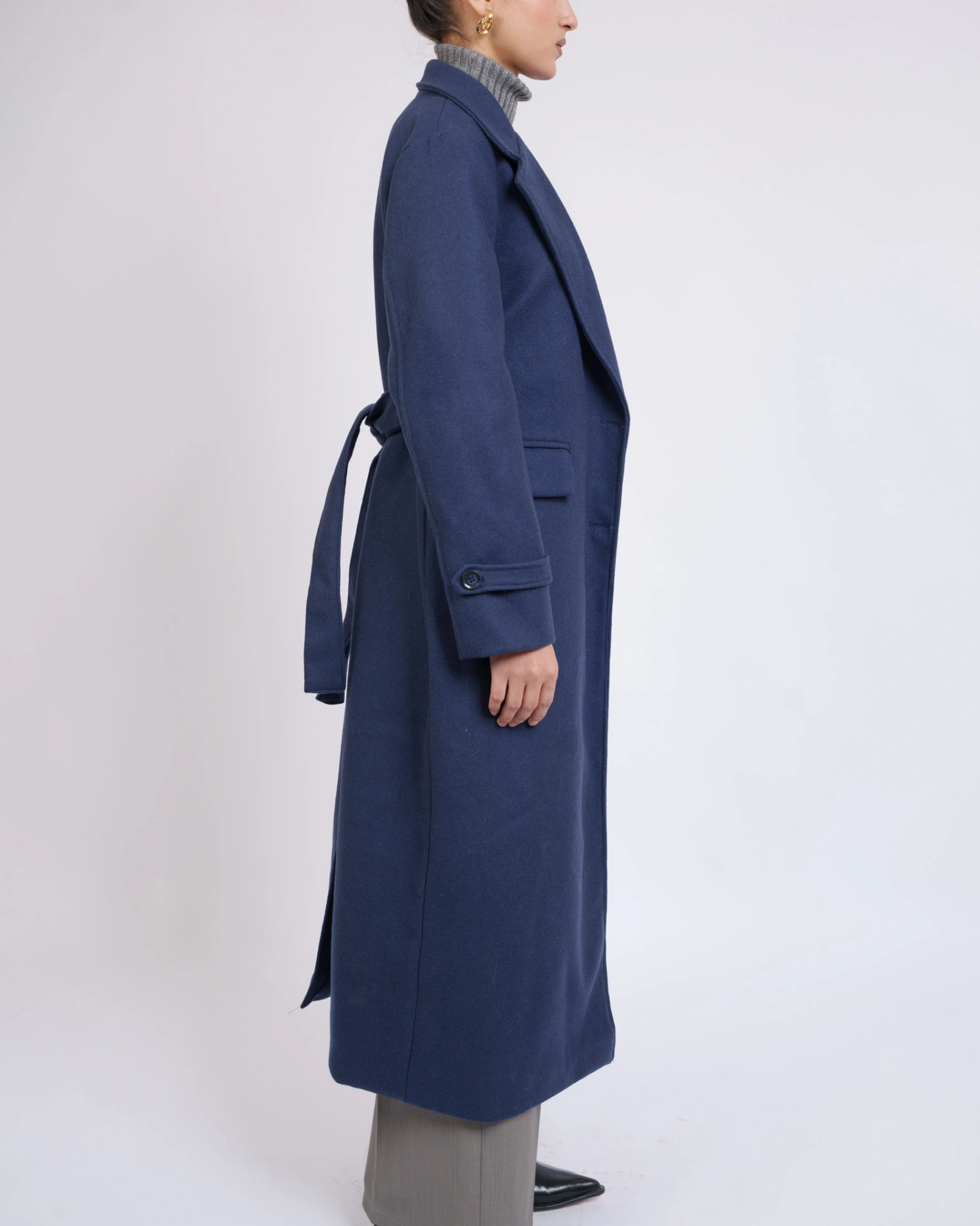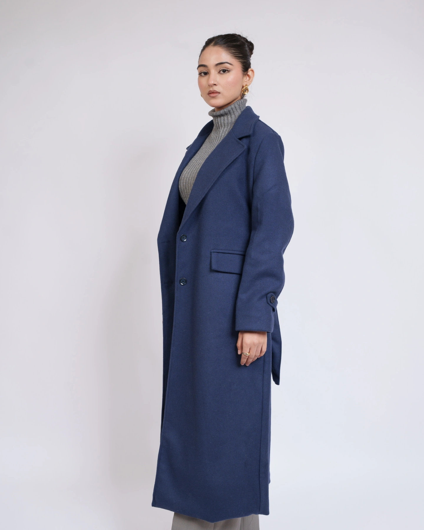 The Rowan Tailored Wool Overcoat combines timeless style with cozy comfort. Crafted from premium wool-poly blend fabric, this maxi length coat falls around ankle offering excellent coverage for colder weather. The design features a sleek single-button closure, wide lapels, and a relaxed silhouette, perfect for layering over both casual and formal outfits. A versatile wardrobe essential that keeps you warm while looking effortlessly chic.