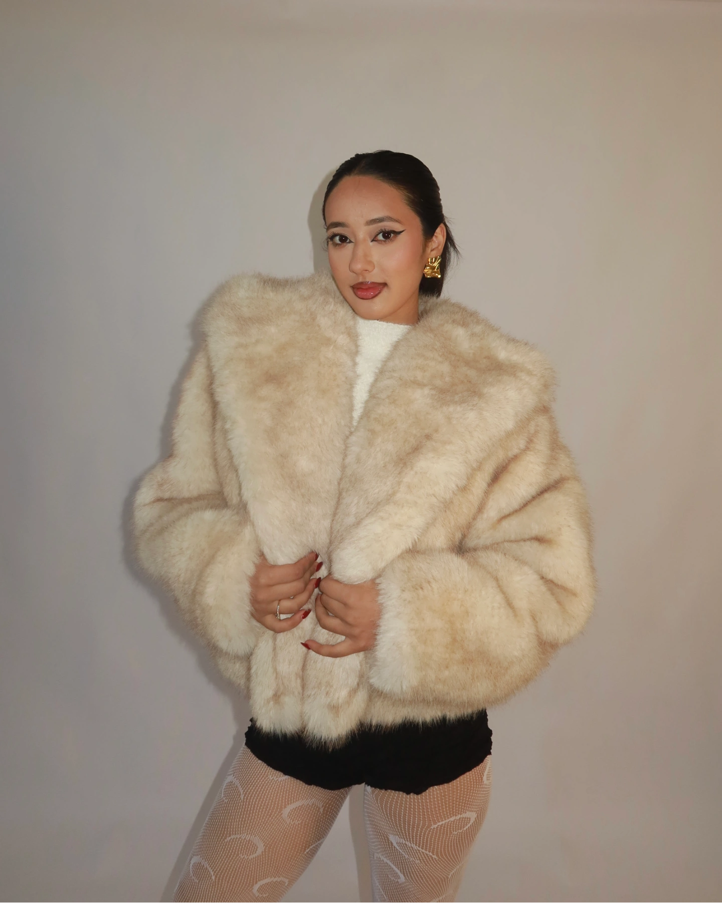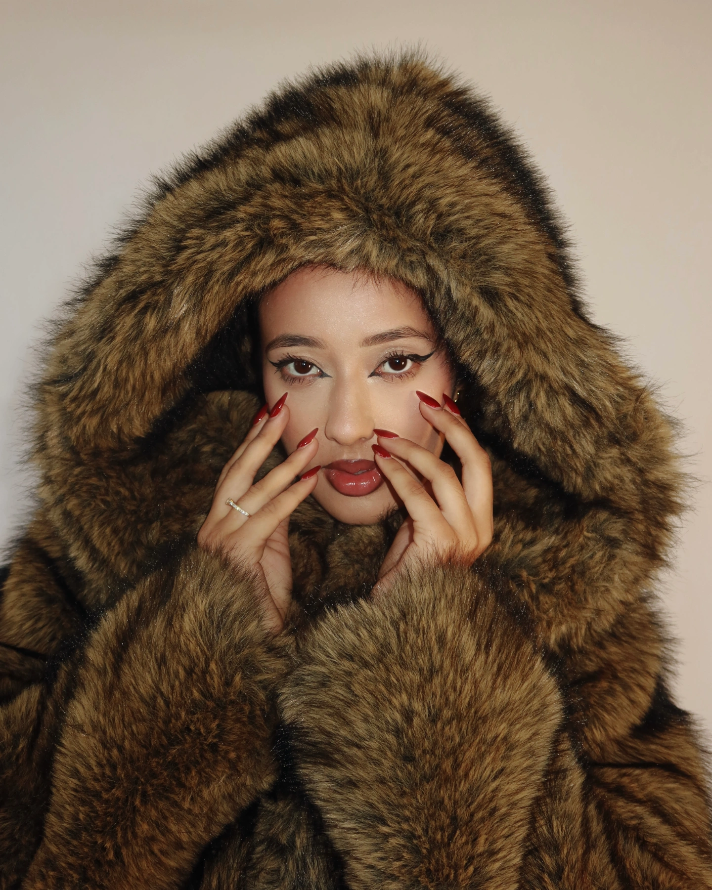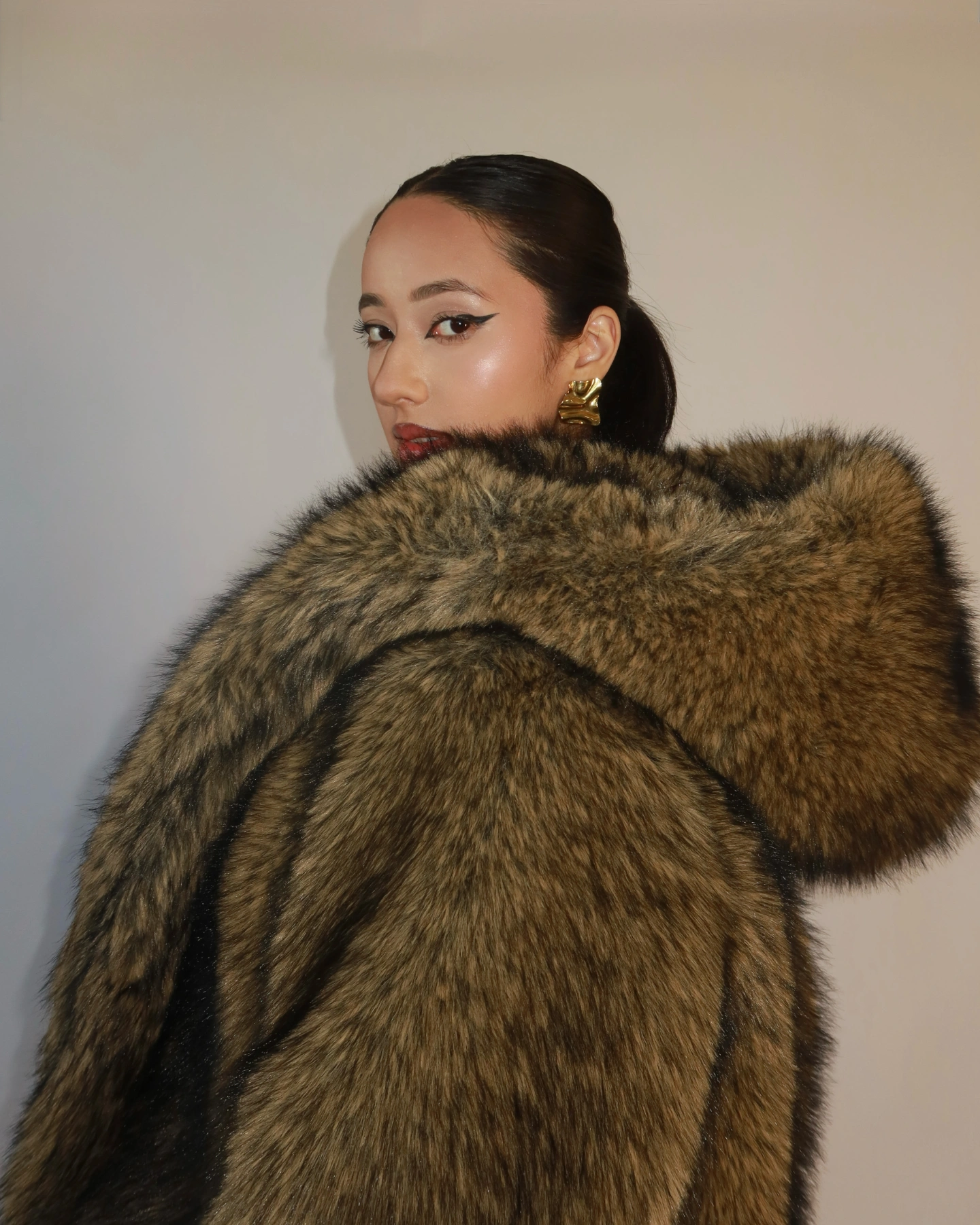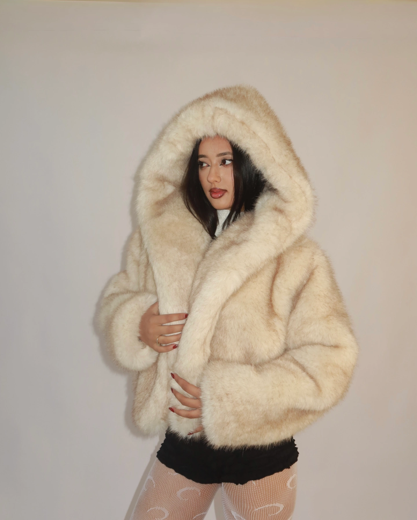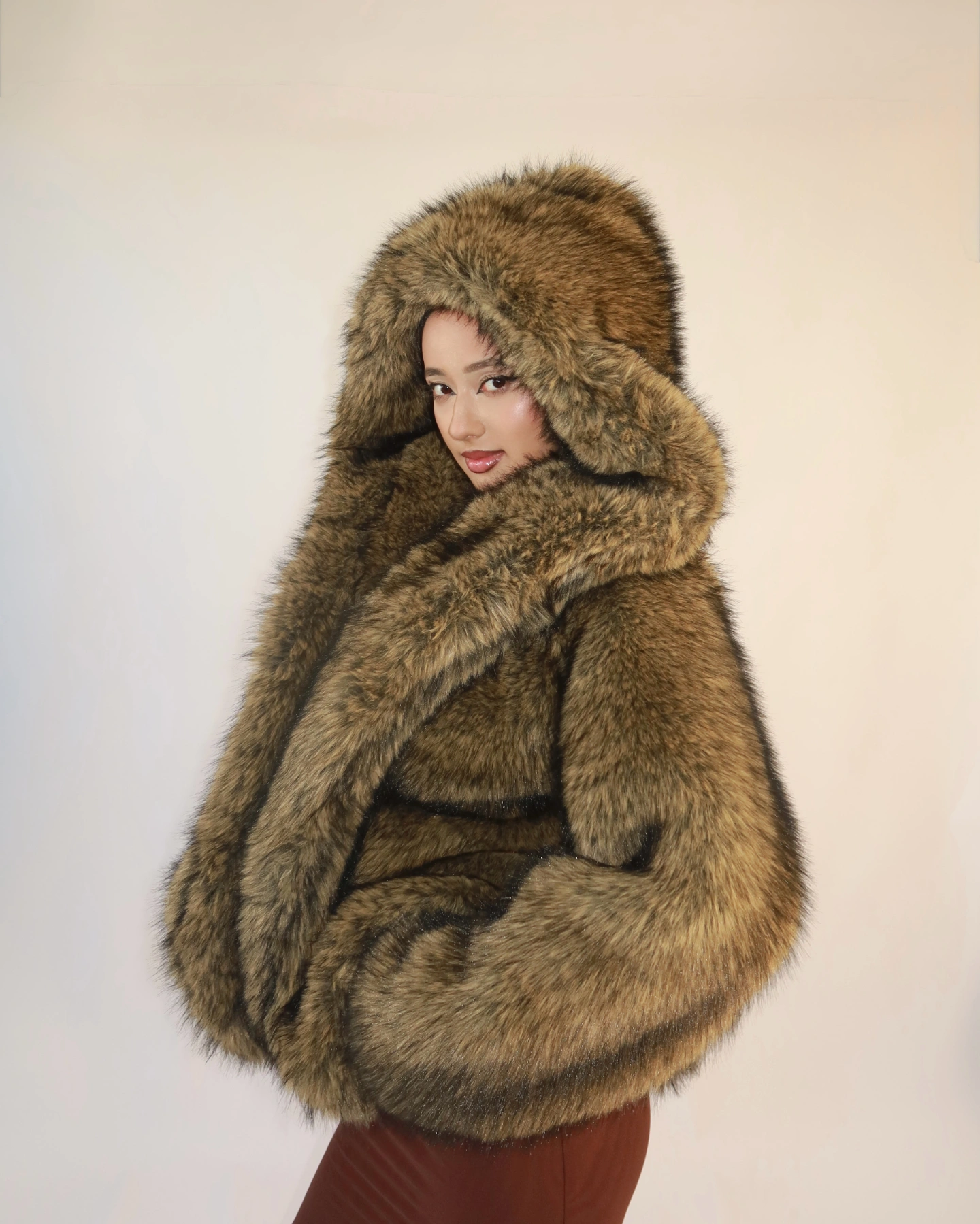 Yazmine Faux Fur Coat is designed to deliver the perfect mix of dramatic style and supreme warmth. Crafted from luxurious dense faux fur, it offers a statement making silhouette with a cropped oversized fit. The deep, plush hood adds an element of mystery and cozy protection against the cold. Style it with baggy jeans, mini dresses, or fitted skirts for a trendy finish. Ideal for outdoor winter events, casual outings, or adding a high fashion layer to any evening look, this jacket is a must have for luxurious, head turning style.