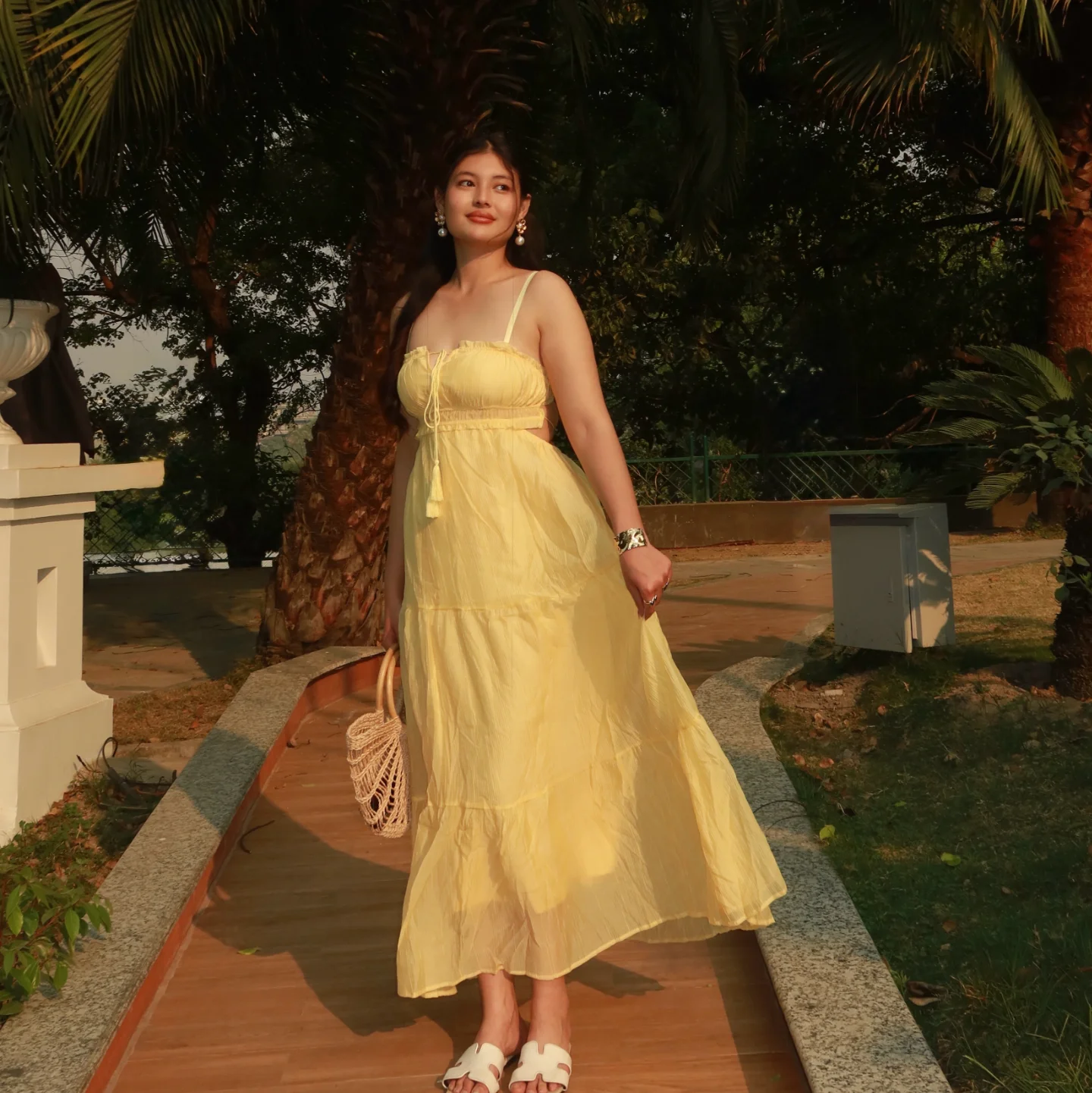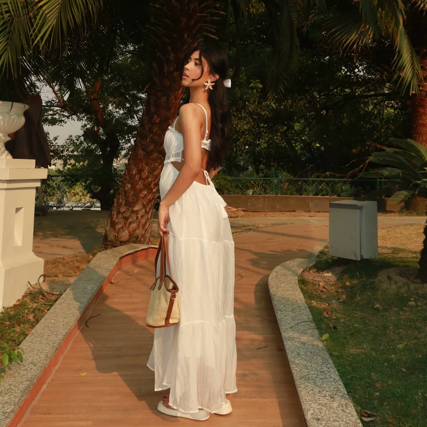 Bask in effortless beauty with the Amalfi Dress. This sleeveless maxi dress features delicate back straps that create a graceful silhouette, perfect for sun-drenched days and balmy evenings. Crafted from lightweight, airy fabric, it ensures comfort and movement with every step. Whether you're strolling by the sea or attending a garden soirée, the Amalfi Dress is your go-to for timeless sophistication.