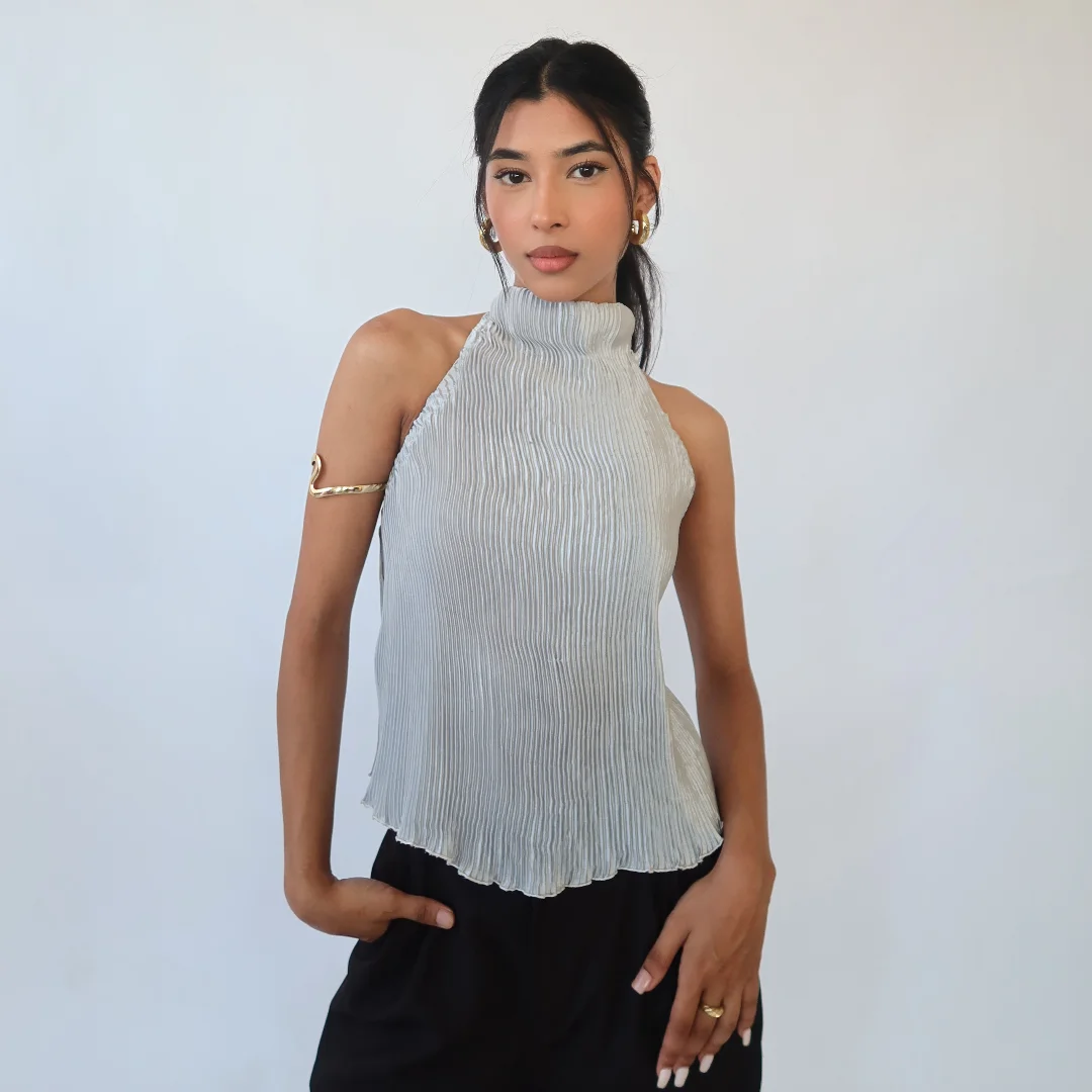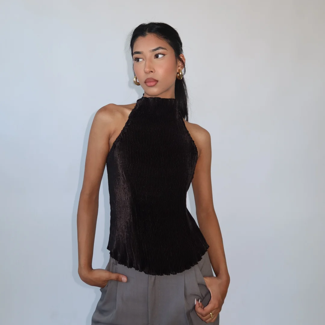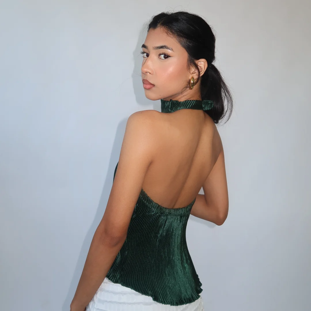 Introducing the Plisse Halter Top – crafted from luxurious satin plissé, this top boasts a rich texture that catches the light beautifully, adding dimension to any outfit. The halter neckline gracefully frames your shoulders, while the backless design creates a stunning silhouette, perfect for a night out or a chic daytime look. Pair it with high-waisted jeans or a sleek skirt to elevate your ensemble.