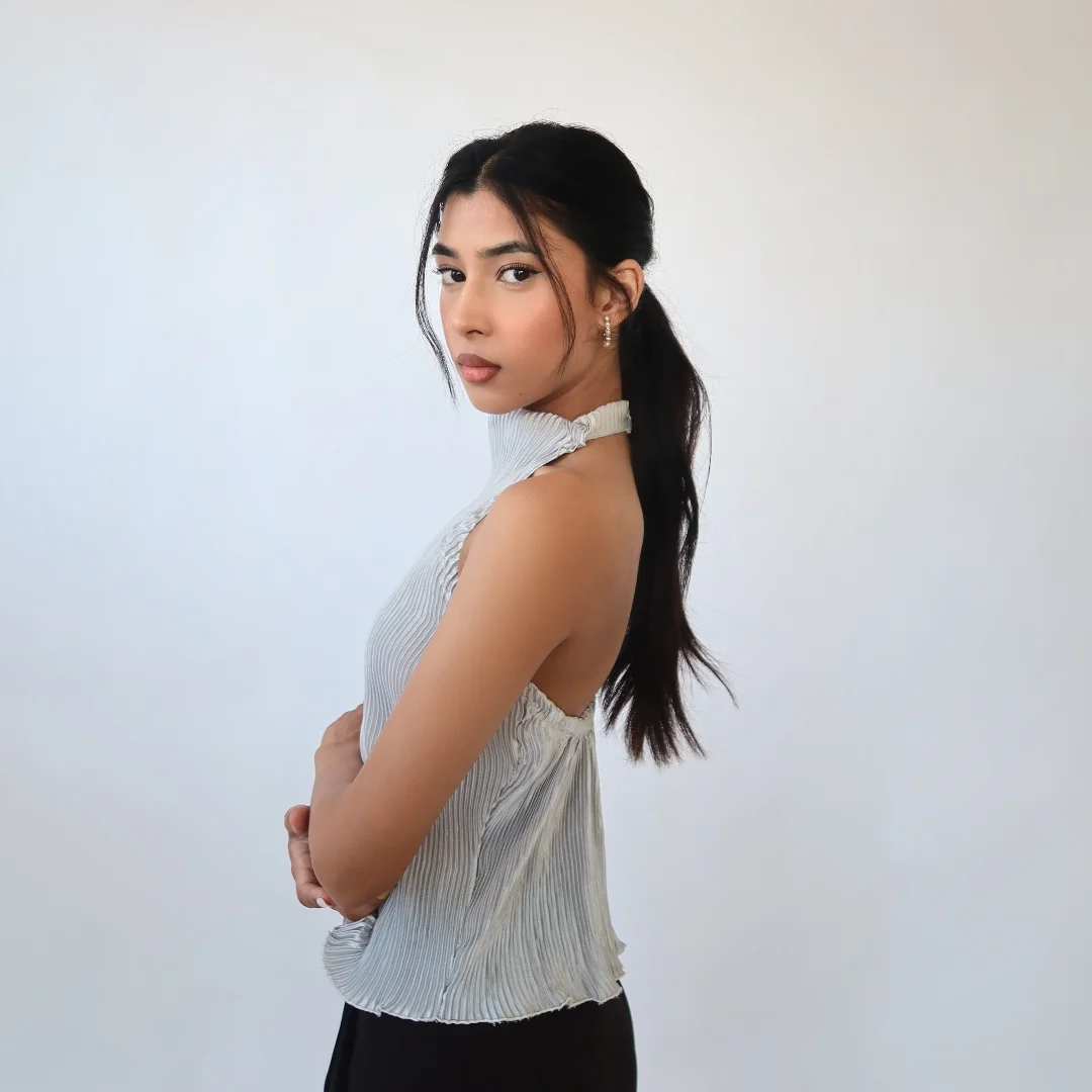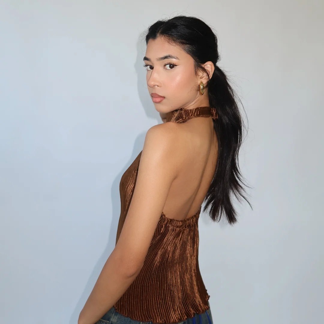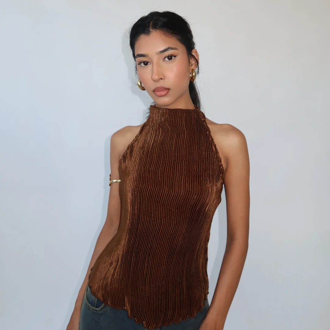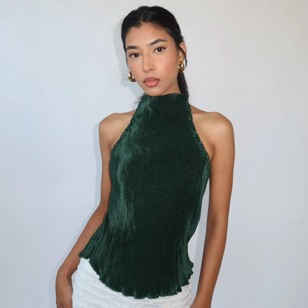 Introducing the Plisse Halter Top – crafted from luxurious satin plissé, this top boasts a rich texture that catches the light beautifully, adding dimension to any outfit. The halter neckline gracefully frames your shoulders, while the backless design creates a stunning silhouette, perfect for a night out or a chic daytime look. Pair it with high-waisted jeans or a sleek skirt to elevate your ensemble.