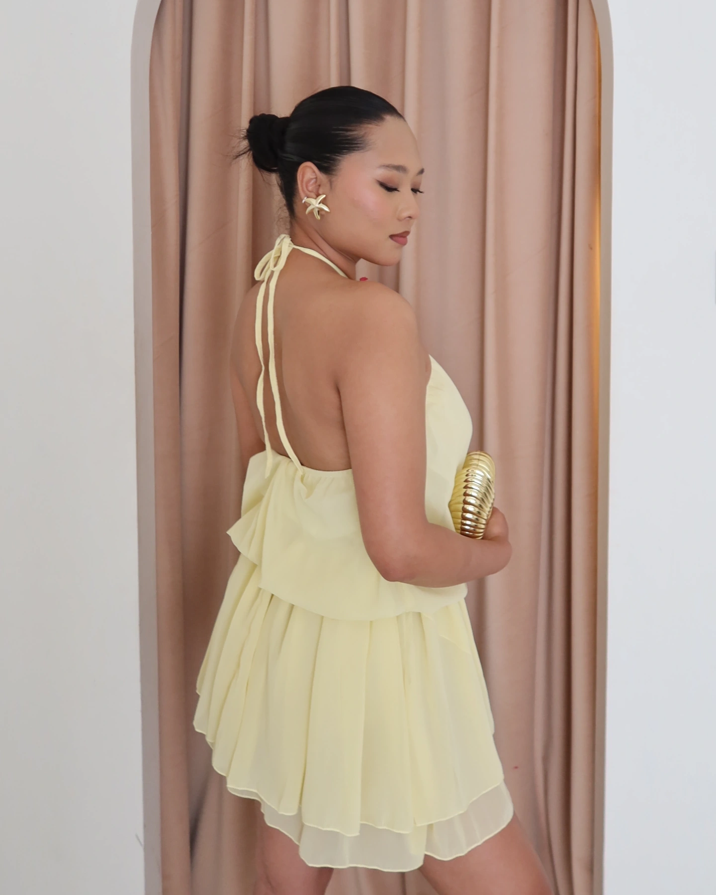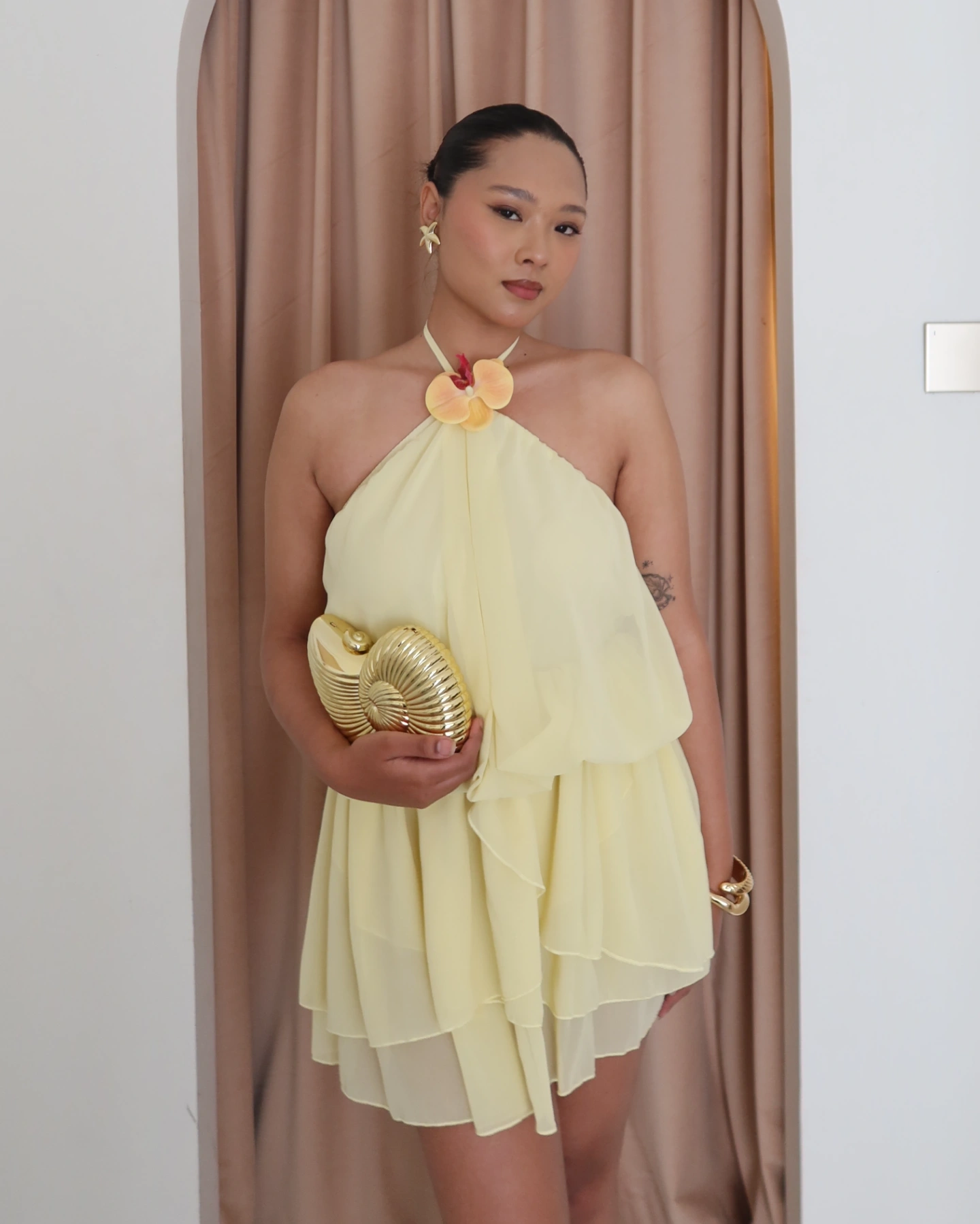 Embrace a playful yet sophisticated charm with the Orchid Dress, a piece that perfectly balances airy volume with delicate floral details. Crafted from a Georgette fabric, it features a graceful halter neckline adorned with a signature 3D orchid accent that adds a touch of whimsical elegance. The tiered, ruffled skirt creates a breezy, fluid movement, while the loose fitting bodice offers a comfortable, effortless silhouette. Style this dreamy piece with strappy heels and gold jewelry for a polished look, or choose flat sandals for a more relaxed, sun drenched vibe at garden parties, tropical vacations, or summer brunch dates.